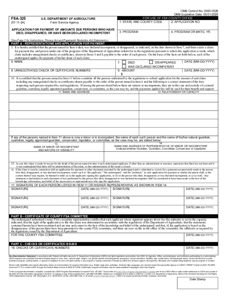 The FSA-325 form is designed to apply for payments owed to individuals who are deceased, disappeared, or declared incompetent. This form is relevant for beneficiaries seeking to claim payments due from the U.S. Department of Agriculture’s Farm Service Agency (FSA). Utilizing the FSA-325 form streamlines the process of agricultural payment claims, ensuring that rightful beneficiaries can access owed amounts efficiently.
