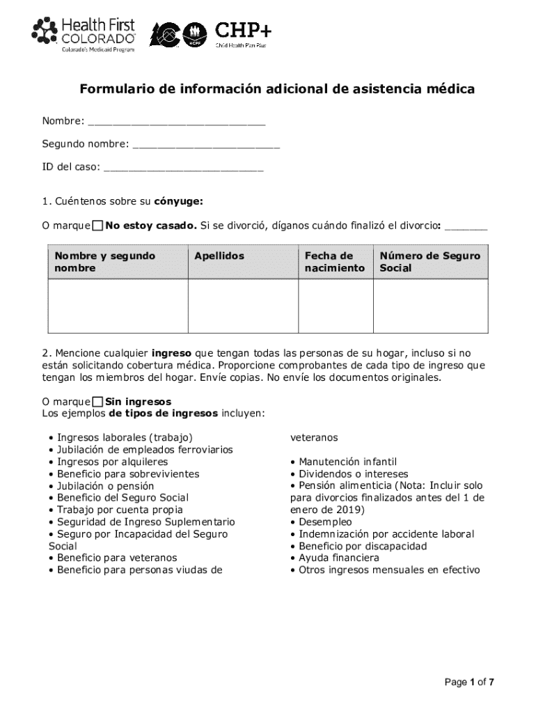 El Formulario de Información Adicional para Asistencia Médica es un documento utilizado por individuos para proporcionar detalles sobre ingresos y recursos necesarios para la asistencia médica.