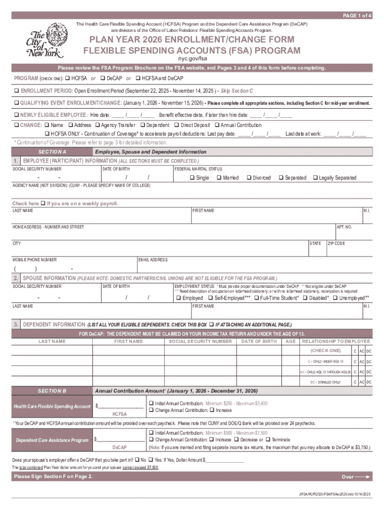 The New York City FSA Enrollment Form 2026 is a crucial document enabling employees to enroll or modify their Health Care Flexible Spending Account (HCFSA) and Dependent Care Assistance Program (DeCAP) for the upcoming plan year. This form primarily serves to facilitate adjustments pertinent to 2026. It includes essential information like personal details, dependent data, and contribution amounts, which are vital for accurate enrollment.