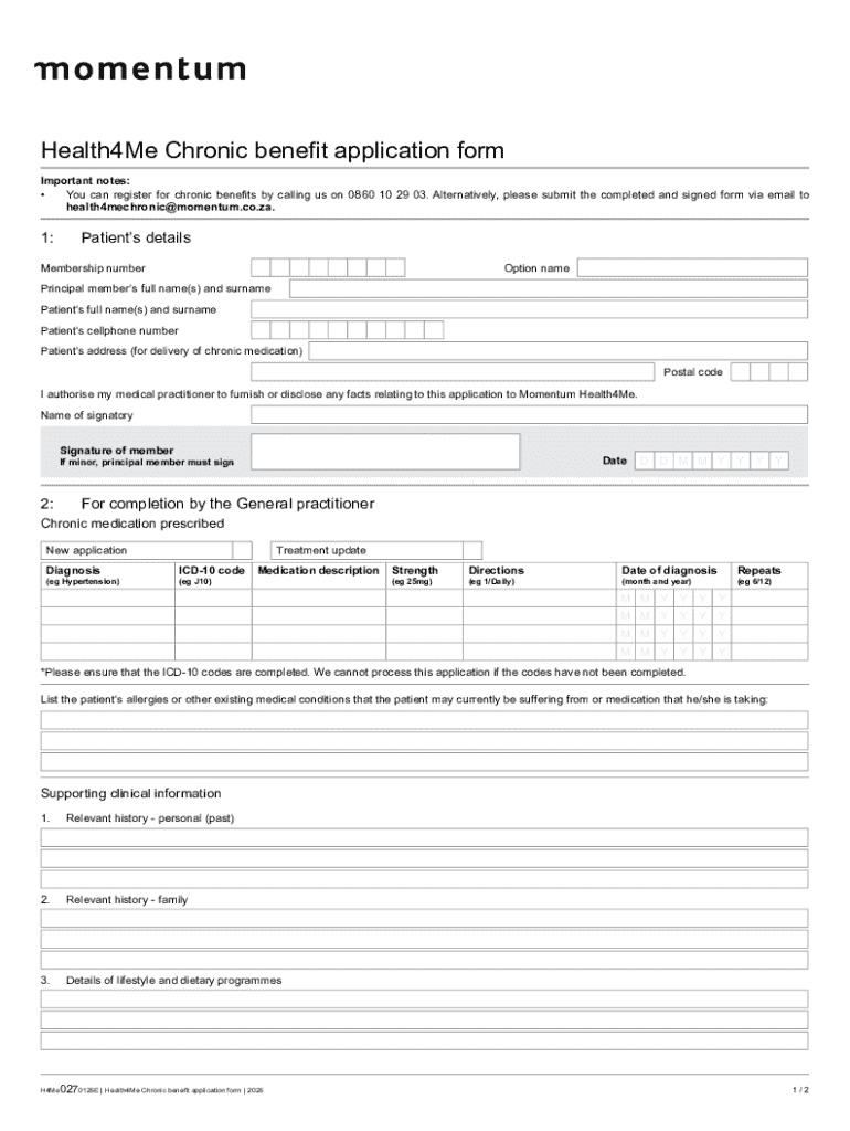 The Health4Me Chronic Benefit Application Form is crucial for patients seeking chronic medication benefits through Momentum Health4Me. This application form serves as a formal request, outlining essential information regarding the patient and their medical circumstances. It plays a vital role, enabling patients to secure necessary treatments while allowing healthcare providers to facilitate ongoing medical support.