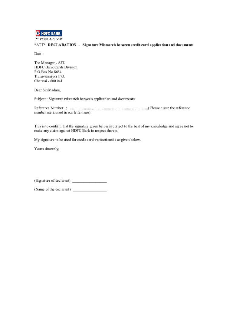 The HDFC Bank Signature Mismatch Declaration is a crucial document used to confirm the correctness of a signature in credit card transactions. It plays an essential role in facilitating secure financial transactions by ensuring that the signature on the credit card application aligns with the signature on supporting documents.