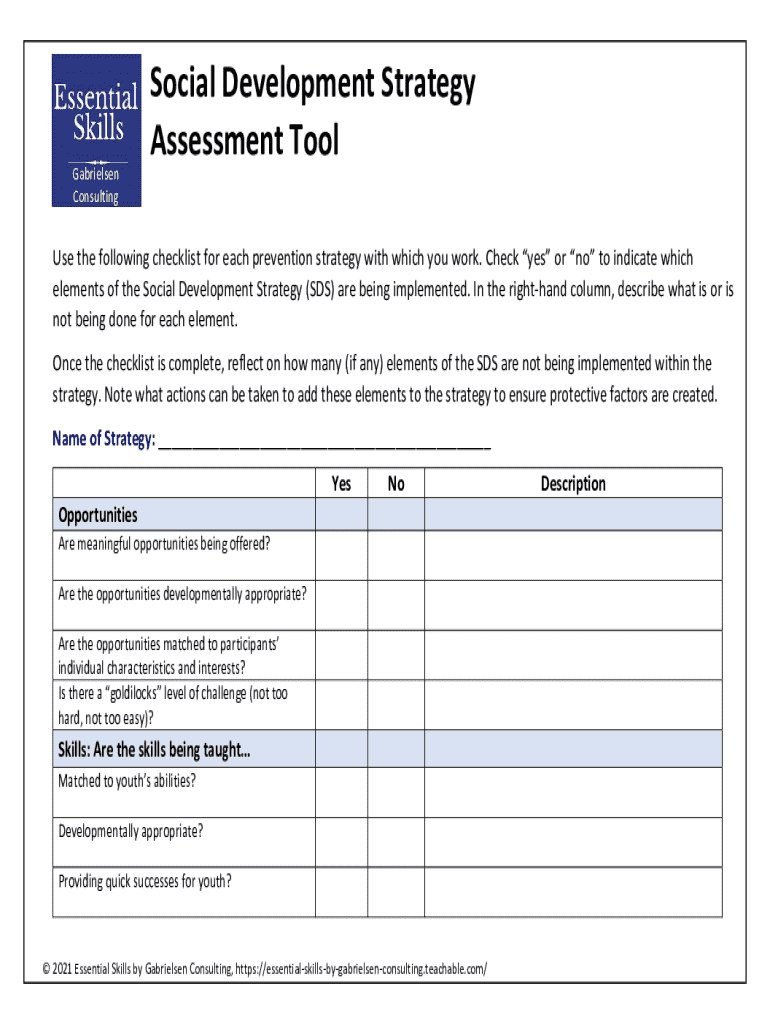 The Social Development Strategy Assessment Tool (SDS Assessment Tool) serves as a pivotal instrument for evaluating prevention strategies in youth development. It comprises a structured checklist format designed to guide users through assessing various protective factors integral to youth development.