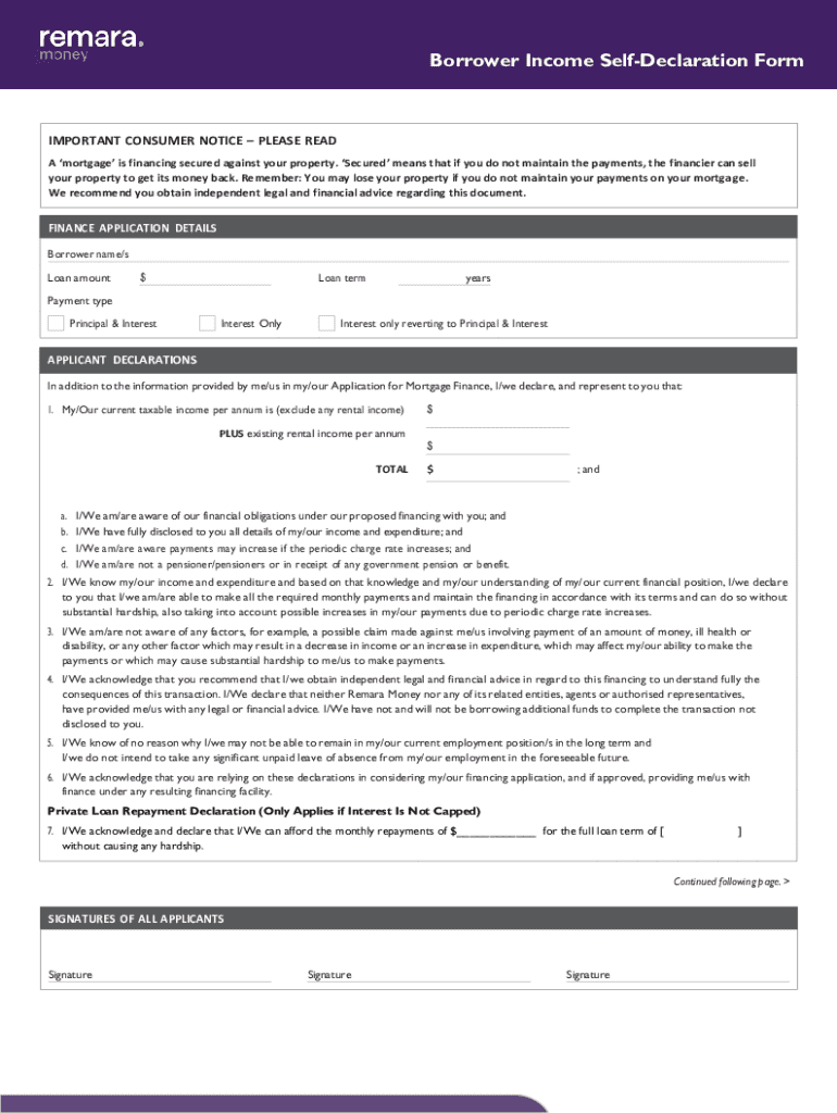 The Borrower Income Self-Declaration Form is a financial document used by borrowers in Australia to declare their income and financial obligations when applying for a mortgage loan.