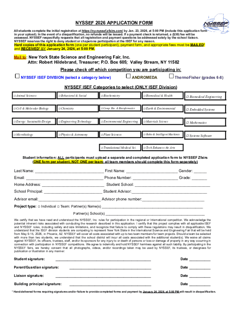 Students in New York State who wish to participate in the NYSSEF 2026 must complete the application form, with signatures from required roles, including a parent/guardian.