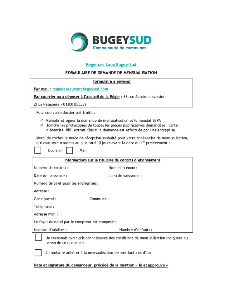 Cette demande peut être utilisée par les résidents et les entreprises de Bugey-Sud qui souhaitent établir un prélèvement mensuel pour leurs factures d'eau.