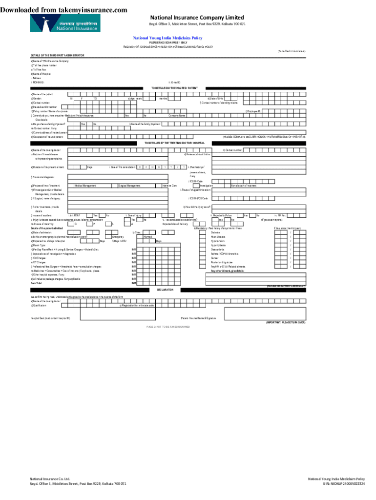 The National Young India Mediclaim Policy Request for Cashless Hospitalisation is a healthcare form used by insured individuals in India to request cashless hospitalization services under their mediclaim insurance policy.