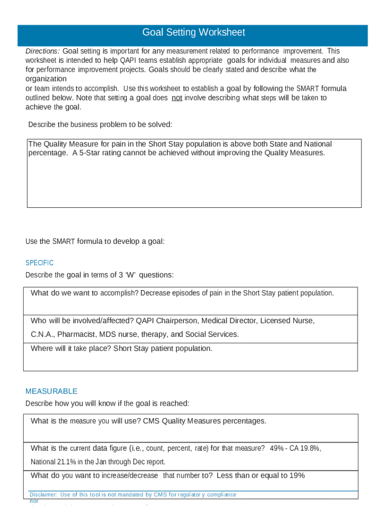 For users seeking guidance, a sample completed Goal Setting Worksheet can provide valuable insights. This example outlines key sections and the rationale behind their inclusion, illustrating how effective goal setting aligns with SMART criteria and QAPI objectives.