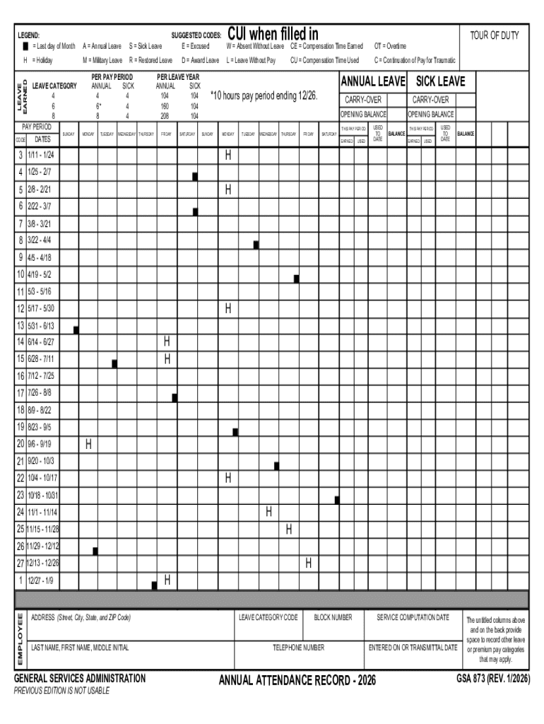 The GSA 873 Annual Attendance Record is a government form used by timekeepers in the U.S. federal government to record employee pay and leave activity.