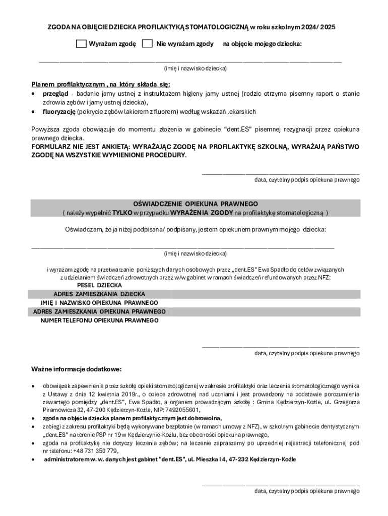 Typically, no additional documents are required with the Dental Prophylaxis Consent Form itself. However, ensure you have your child’s PESEL number and any relevant personal identification information handy.