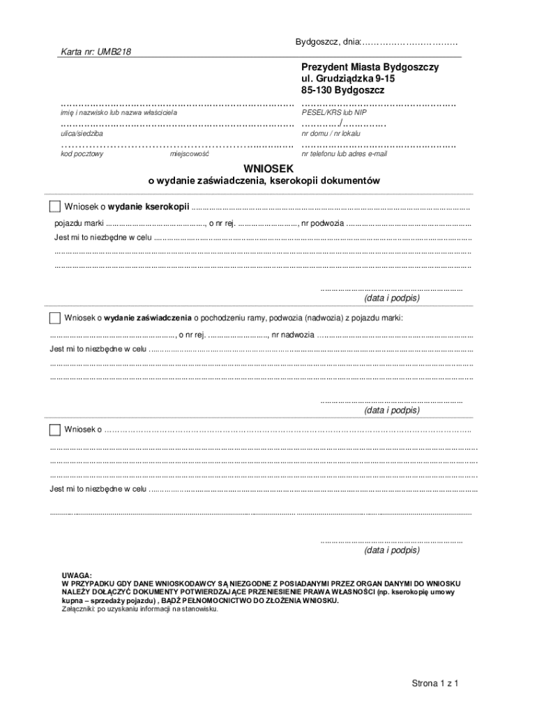 Any resident of Bydgoszcz needing to request vehicle-related documents can fill out this form. Ensure you provide accurate personal and vehicle information.