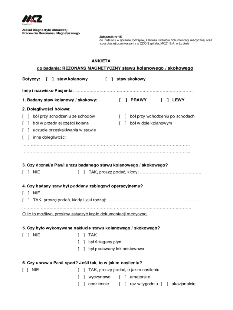 Any patient scheduled for an MRI of the knee or ankle must fill out this questionnaire to provide their medical history and current symptoms.