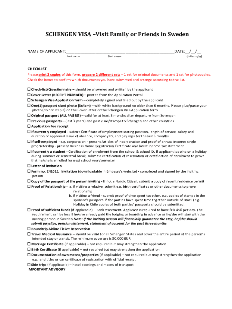 The Schengen Visa Application Form is a visa application document used by individuals to apply for a Schengen visa to visit family or friends in Sweden.