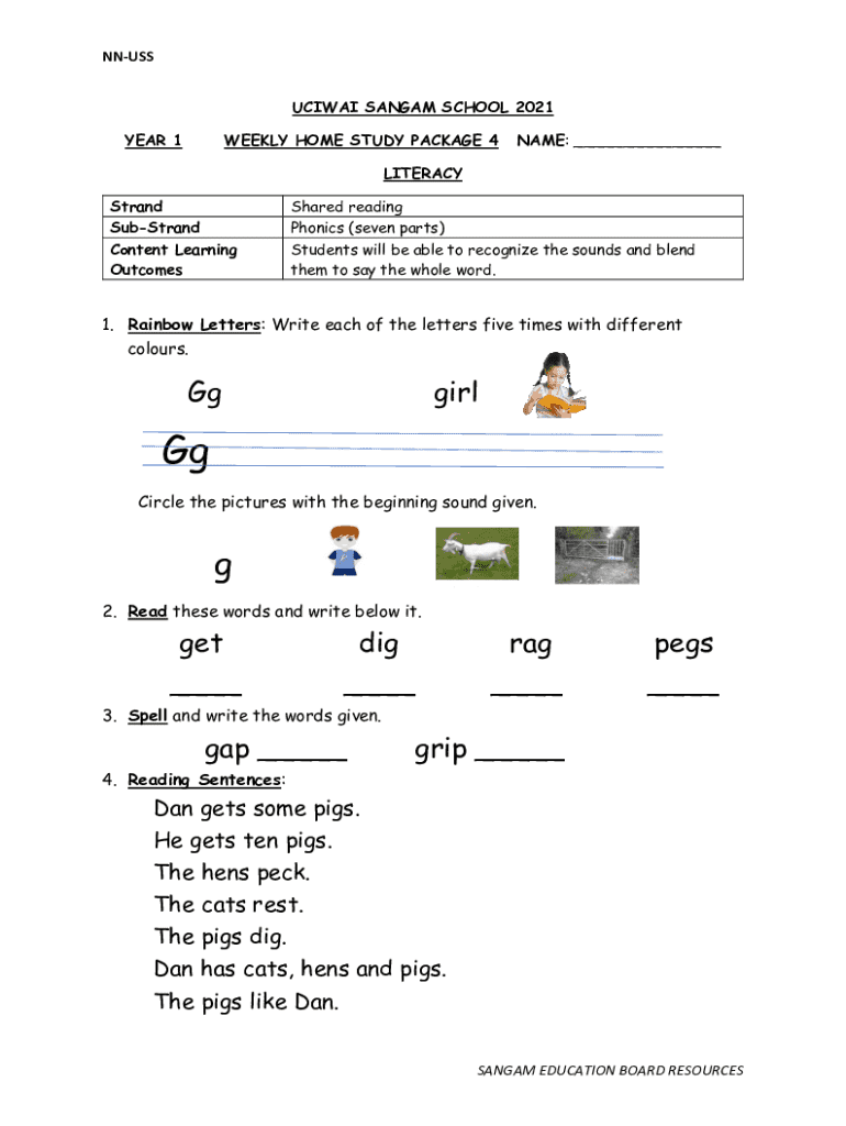 The Year 1 Weekly Home Study Package 4 is an educational document specifically designed for Year 1 students. Its primary function focuses on enhancing literacy and numeracy skills development through engaging activities. This package is a crucial resource connected to the Sangam Education Board Resources, providing structured learning materials to support home study effectively.