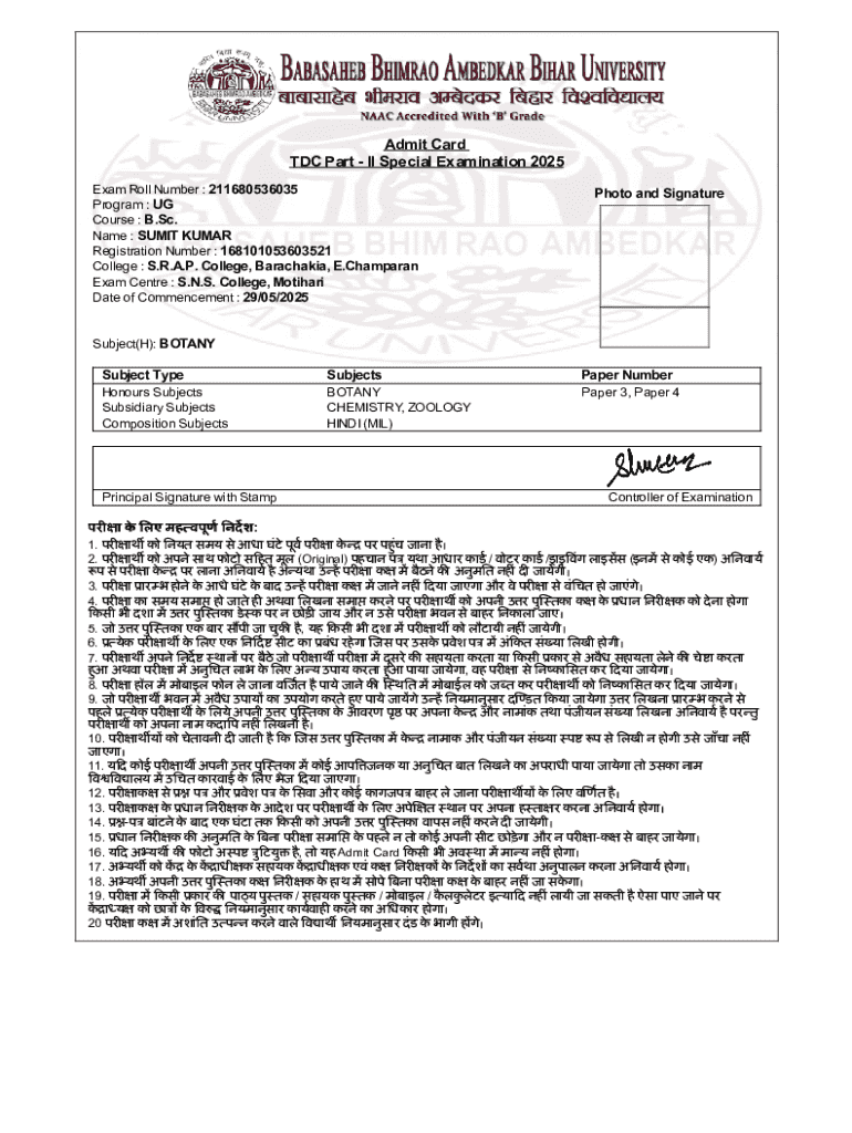 The Admit Card for TDC Part II Special Examination 2025 is an official document used by students to certify their eligibility for the examination.