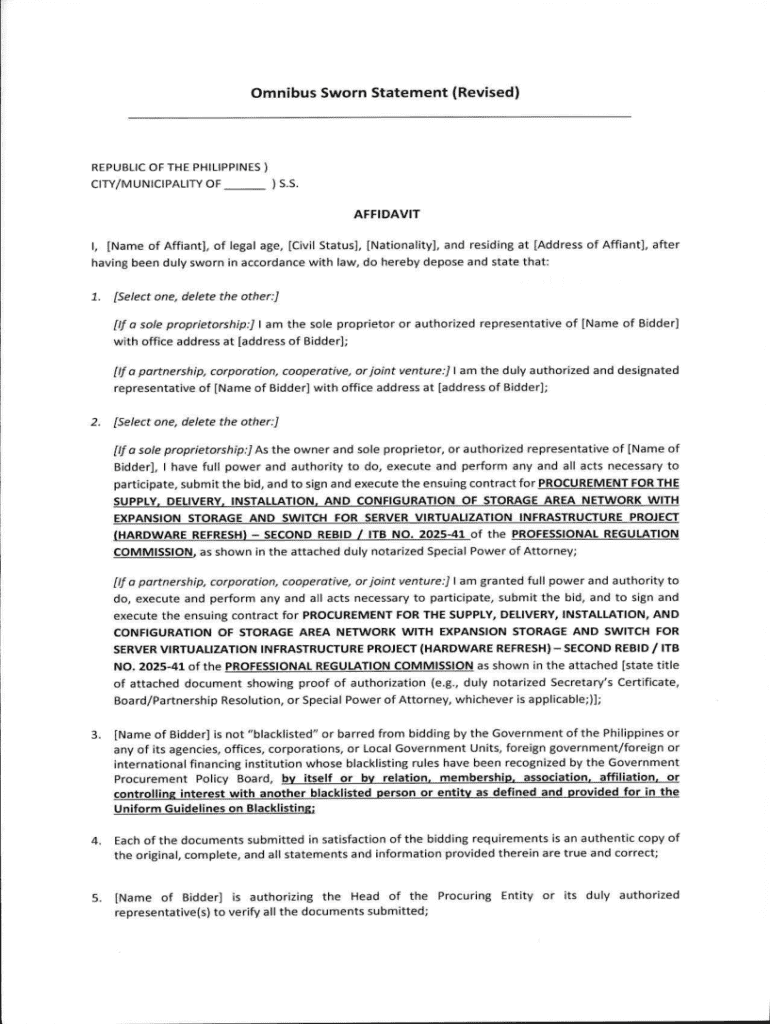 The Omnibus Sworn Statement is a legal document used by bidders in the Philippines to declare their authority and compliance with bidding requirements.