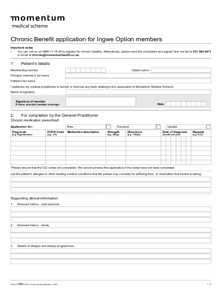 The Chronic Benefit Application Form is a patient consent document used by Ingwe Option members of the Momentum Medical Scheme in South Africa to apply for chronic medication benefits.