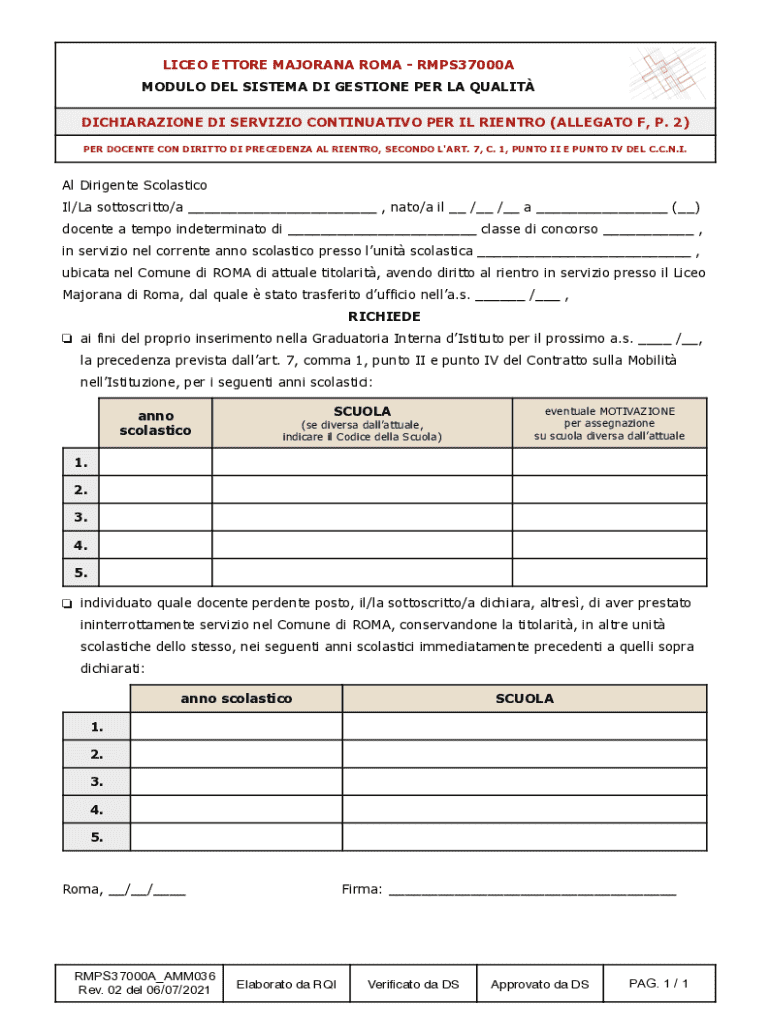La Dichiarazione di Servizio Continuativo per il Rientro è un modulo essenziale per i docenti in Italia, utilizzato per richiedere la precedenza nella Graduatoria Interna di Istituto. Questo modulo richiede informazioni dettagliate sui dati personali del docente e sul servizio svolto, al fine di giustificare la richiesta di rientro a una scuola precedente.