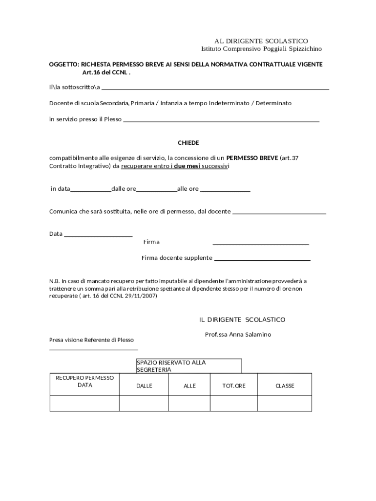 Il modulo è destinato a insegnanti di scuola primaria e secondaria, docenti supplenti, dirigenti scolastici e referenti di plesso in Italia, che necessitano di richiedere un permesso breve.