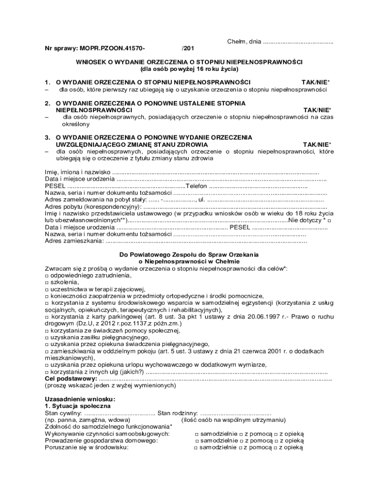 The Disability Status Determination Application is a crucial form in the Polish government system, designed to help individuals over 16 apply for a Polish disability certificate. This application is essential for those seeking to formalize their disability status and connect with relevant support services and benefits. It encompasses personal information, medical evidence, and relevant details about the applicant's social and professional circumstances.