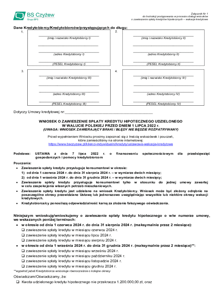 Eligible applicants include borrowers on mortgage loans in Poland seeking temporary suspension due to financial hardship, specifically for the year 2024 as per legal provisions.