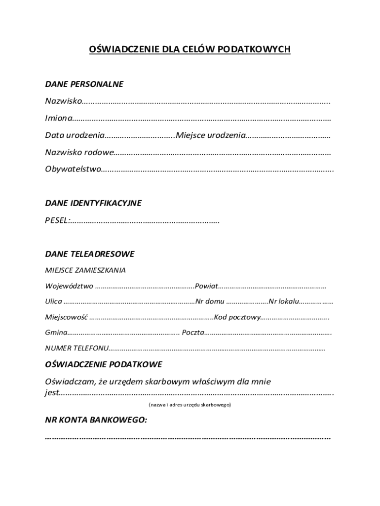 The Tax Affidavit is a specific Polish tax document that plays a crucial role in the tax system of Poland. It is essential for taxpayers to provide accurate personal details, including their PESEL number, address, and bank account information. This document aligns with other tax forms, ensuring proper identification and tax compliance for individuals and entities within the Polish jurisdiction.