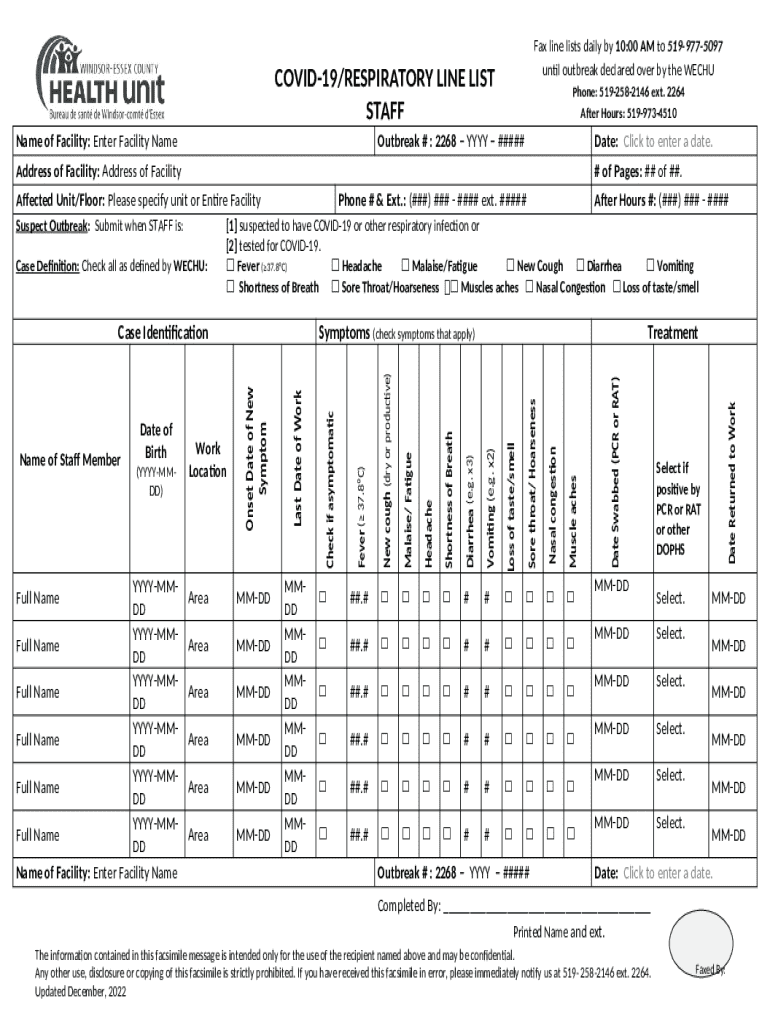 The COVID-19 Respiratory Line List Form should be completed and submitted as soon as symptoms are reported or an outbreak is identified. It remains active until the outbreak is officially declared over by WECHU.