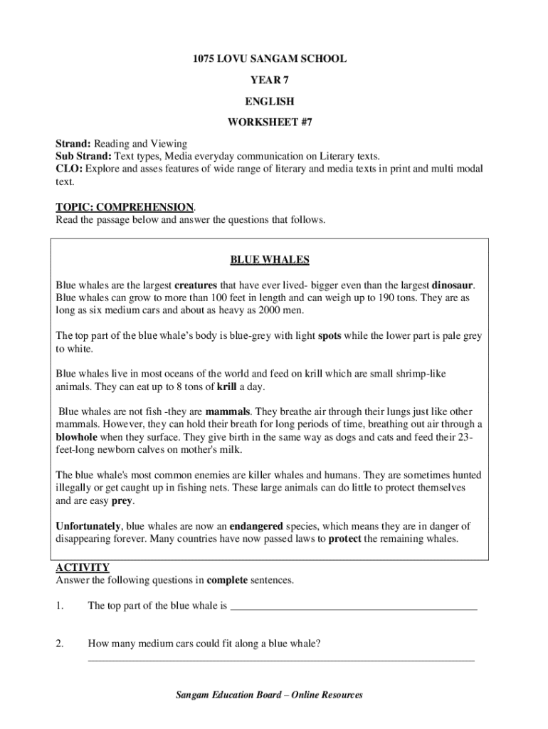 This worksheet serves multiple educational purposes that are vital for Year 7 students. It significantly aids in improving reading comprehension, as students must understand and process the information about blue whales. Furthermore, it encourages critical thinking skills through open-ended questions.