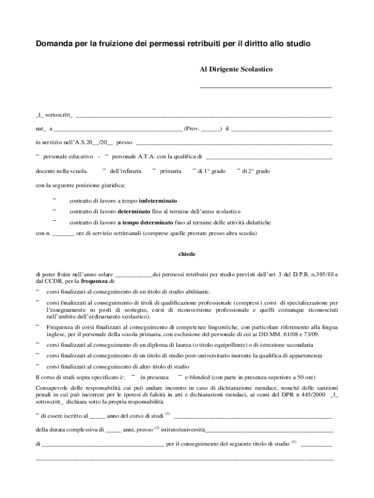 La Domanda per i permessi retribuiti per il diritto allo studio è un modulo essenziale per il personale scolastico in Italia. Il suo scopo è quello di permettere ai dipendenti di richiedere permessi retribuiti per frequentare corsi di studio correlati alla loro professione. Questo modulo differisce da altri perché è specificamente progettato per il personale educativo e non per altre categorie di lavoratori.