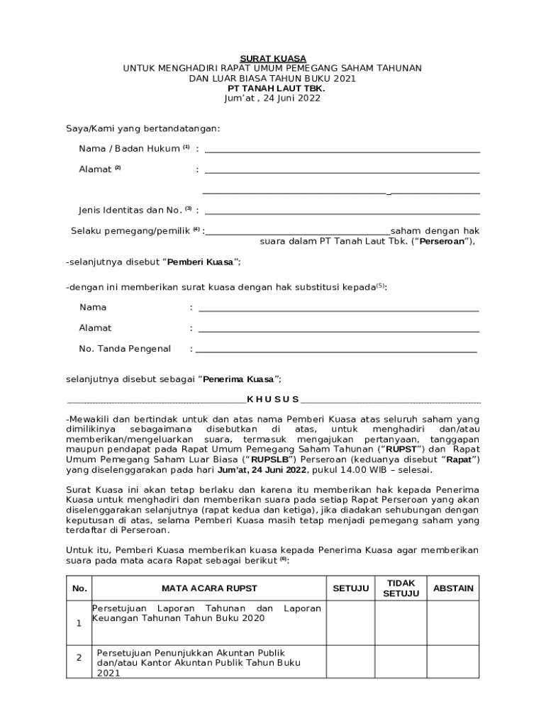 The Surat Kuasa can be used by registered shareholders of PT Tanah Laut Tbk. who wish to authorize a representative to attend and vote at Annual or Extraordinary General Meetings.