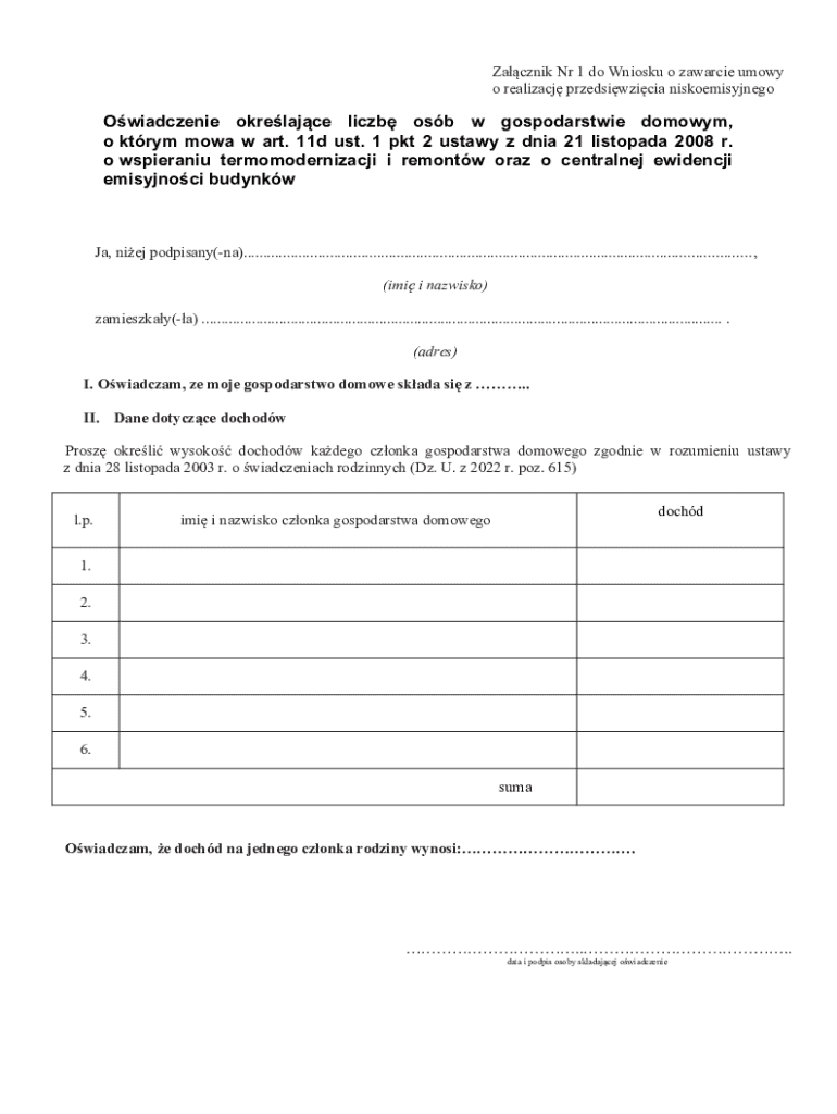 The Oświadczenie o Liczbie Osób w Gospodarstwie Domowym is an affidavit form used by Polish residents to declare household size for low-emission project applications.