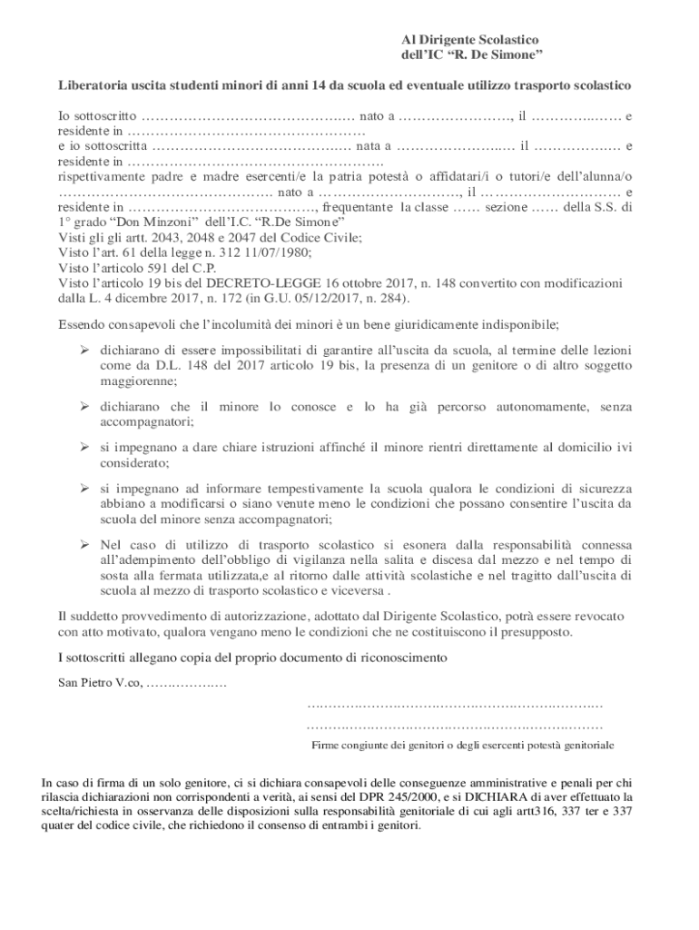 Ottieni il gratuito Liberatoria Uscita Studenti Minori