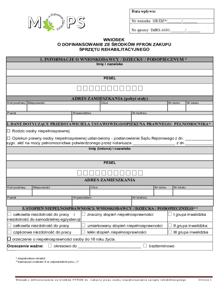 The PFRON application form is designed for residents of Dąbrowa Górnicza who have disabilities and are in need of assistance. Eligible individuals include those who require rehabilitation equipment to enhance their daily living experiences. Family members or guardians can also act as representatives to aid in the application process, ensuring that those needing assistance are represented effectively.
