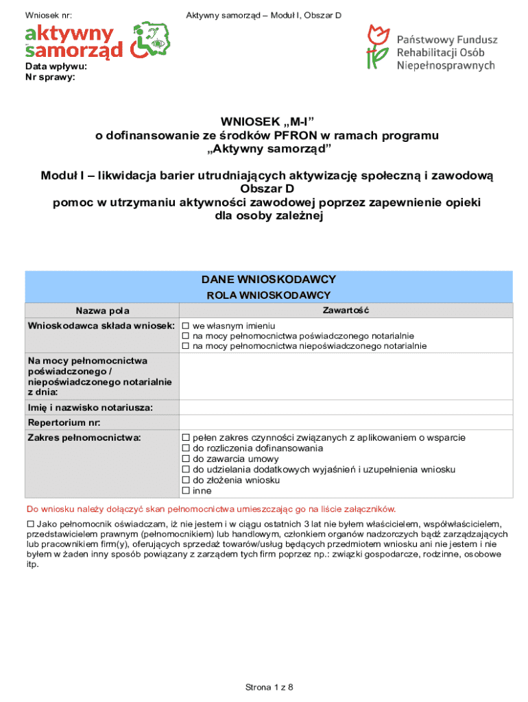 The Aktywny Samorząd Moduł I Obszar D Application is a government form used by Polish citizens to apply for PFRON funding to support professional activities and care for a dependent person.