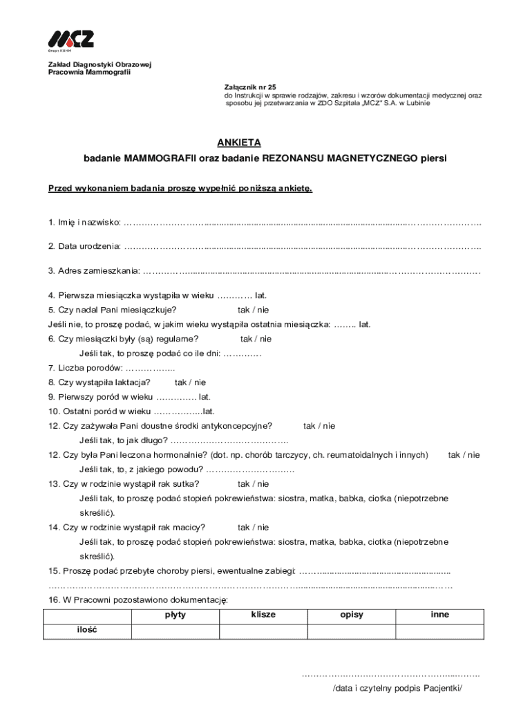 The Mammography and MRI Breast Examination Questionnaire is a critical form utilized in Poland to collect vital medical history and personal information from patients prior to undergoing breast imaging procedures. This healthcare form plays a significant role in the breast imaging process, ensuring that healthcare providers have the necessary background to conduct assessments and screenings effectively. By capturing relevant data, the questionnaire aids in enhancing the accuracy of diagnoses and treatment planning, thus underscoring its importance within Polish healthcare.