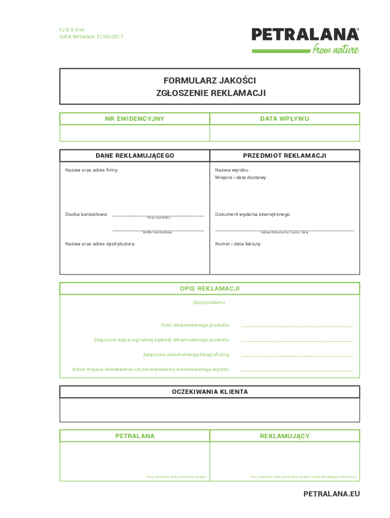 The Quality Complaint Form FJ 8.3-3 is available for any consumer or business in Poland who has experienced product quality issues with Petralana's offerings.