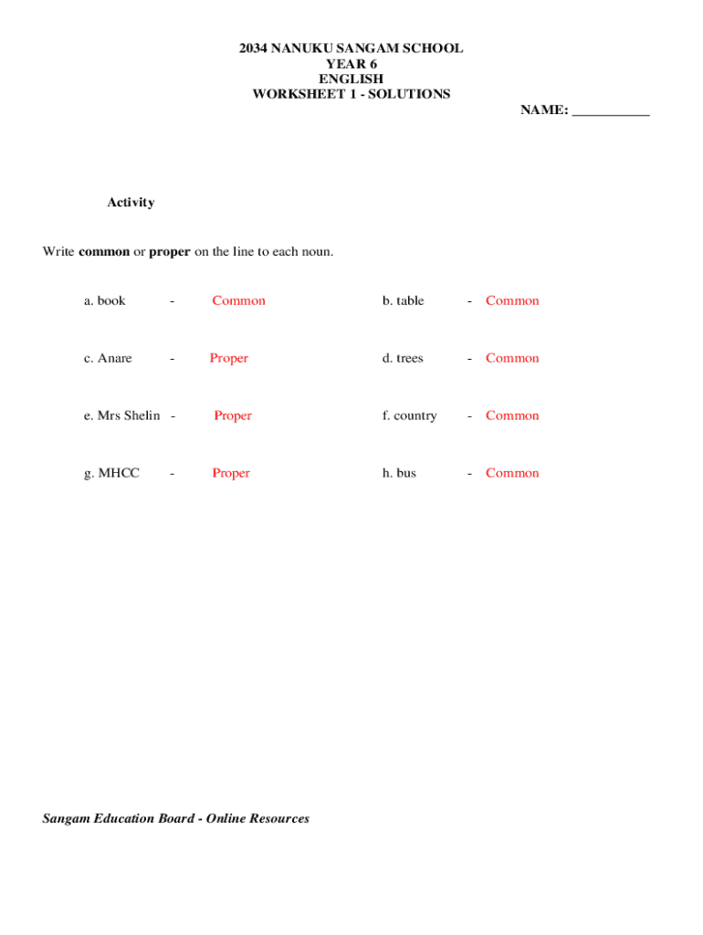 This worksheet is essential for Year 6 students as it helps improve their understanding of language fundamentals. It facilitates independent practice, reinforcing their skills in recognizing common and proper nouns. By aligning with the Sangam Education Board’s curriculum, it supports preparatory work for academic success.