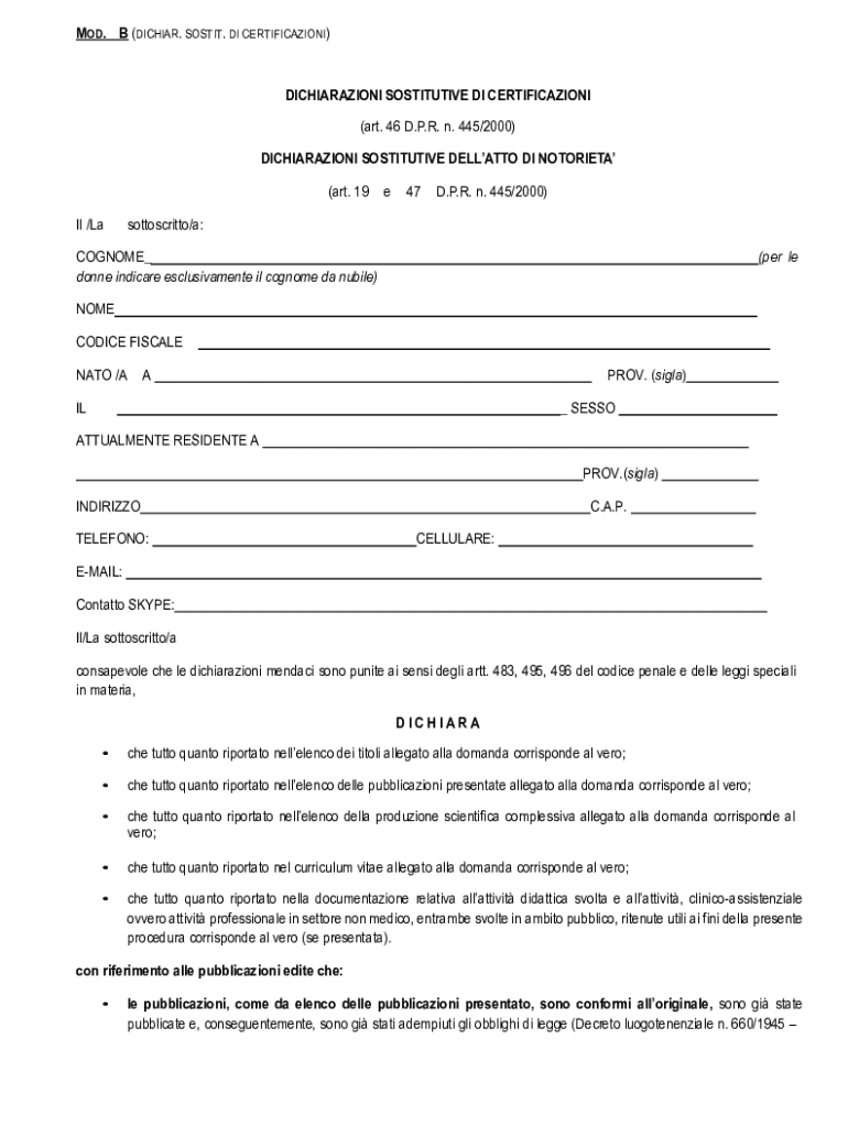 Generalmente, è utile avere documenti come curricula, pubblicazioni, e attestati professionali a supporto delle informazioni dichiarate.
