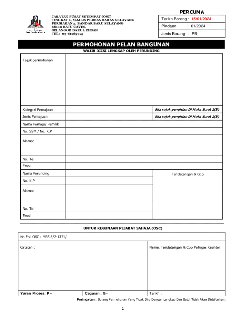 The Malaysia Building Plan Application Form is a government document used by developers and owners to submit building plans to the Majlis Perbandaran Selayang for approval.