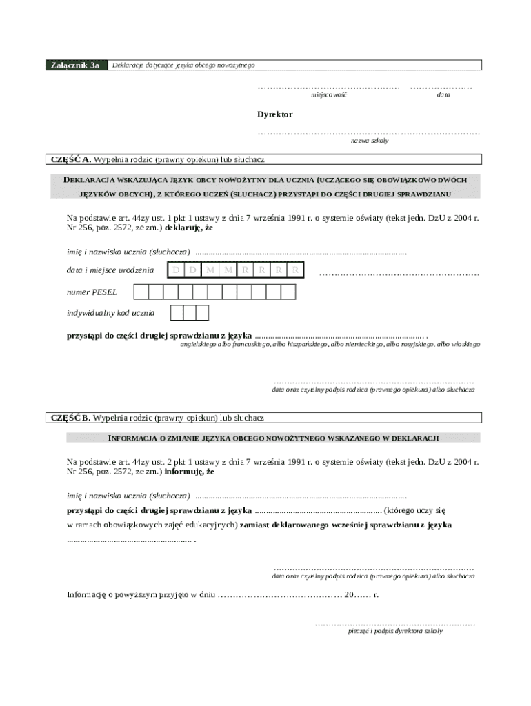 The Foreign Language Declaration Form is an essential document in Polish education. It serves a critical purpose for students declaring their chosen foreign language for examinations. This form not only facilitates the formal declaration process but also underscores its importance in accurately recording language choices in educational settings.