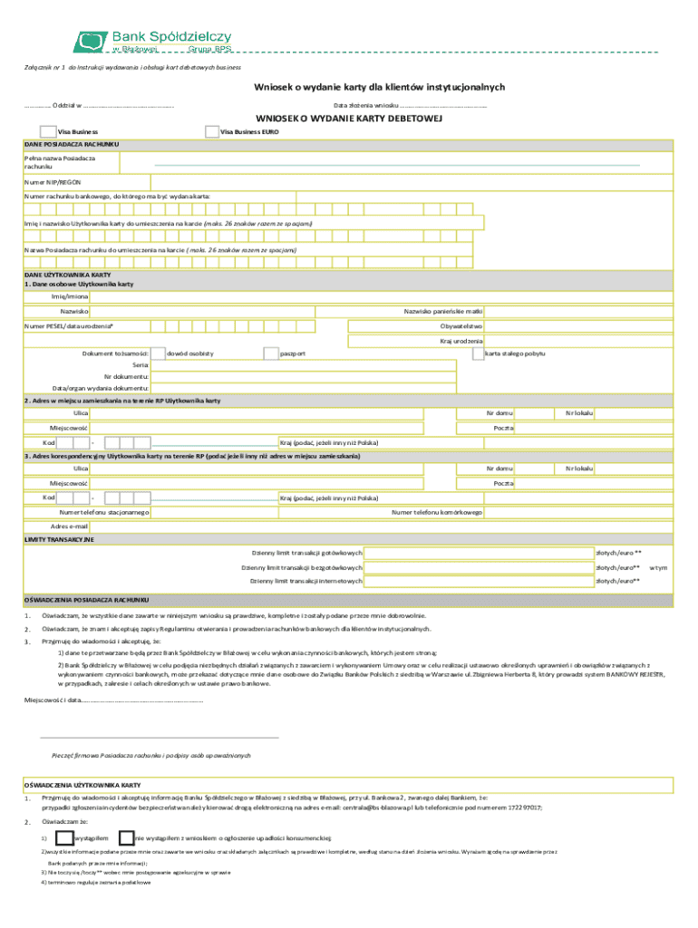 The Visa Business Debit Card Application is a business document used by institutional clients in Poland to request the issuance of a business debit card.