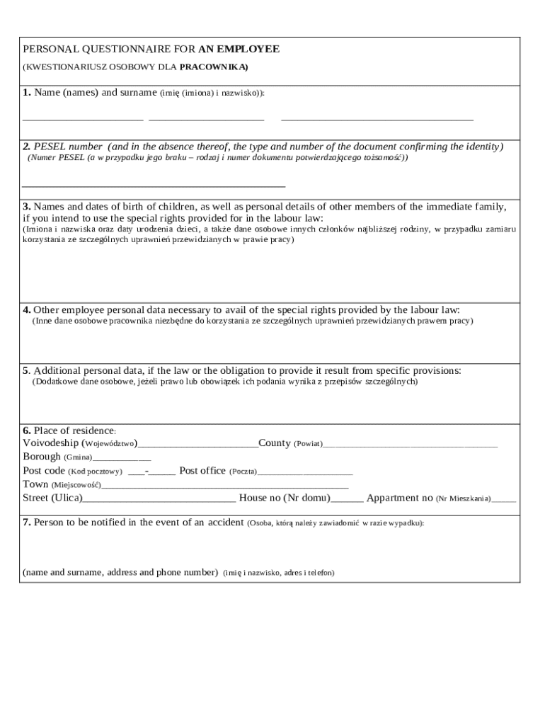 Get the free Employee Personal Questionnaire