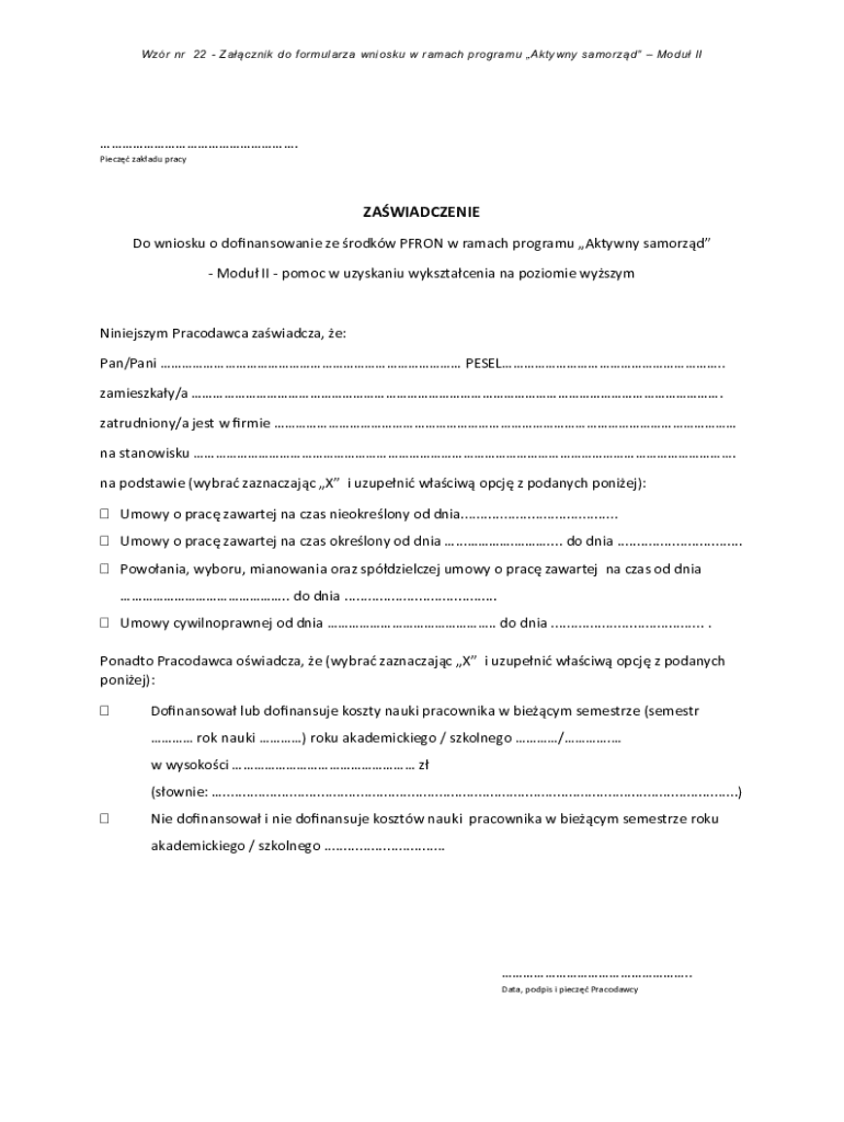 The Poland Active Municipality Program Form 22 is a government document used by employers to certify employee education support within the 'Aktywny samorząd' program.