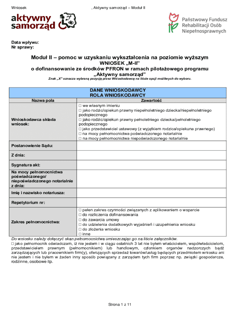 The Aktywny Samorząd Moduł II Application Form is utilized in Poland to apply for financial assistance from PFRON for higher education. This application is vital as it opens opportunities for students, enabling them to access funds crucial for their educational pursuits. Completing this form correctly is important for potential applicants to ensure they receive the necessary support.