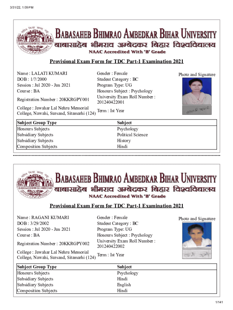 The Provisional Exam Form for TDC Part-1 Examination 2021 is essential for students at Jawahar Lal Nehru Memorial College. This form facilitates the registration for the undergraduate exam, allowing students to participate in the upcoming examination. All first-year undergraduate students need to fill it out to confirm their eligibility.