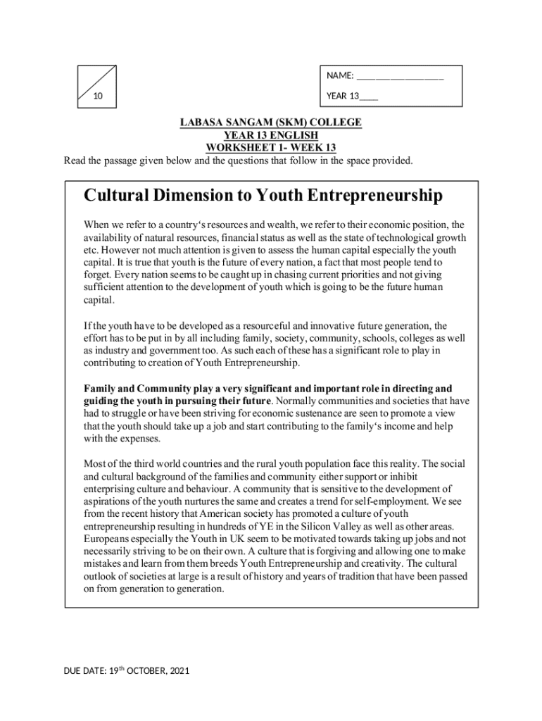The Youth Entrepreneurship Worksheet includes several important elements that facilitate learning. Among these features is a reading passage that contextualizes the questions students will answer. Furthermore, its fillable format allows for a user-friendly experience, making it accessible and efficient for students to complete. This academic worksheet template highlights the importance of interactive learning.