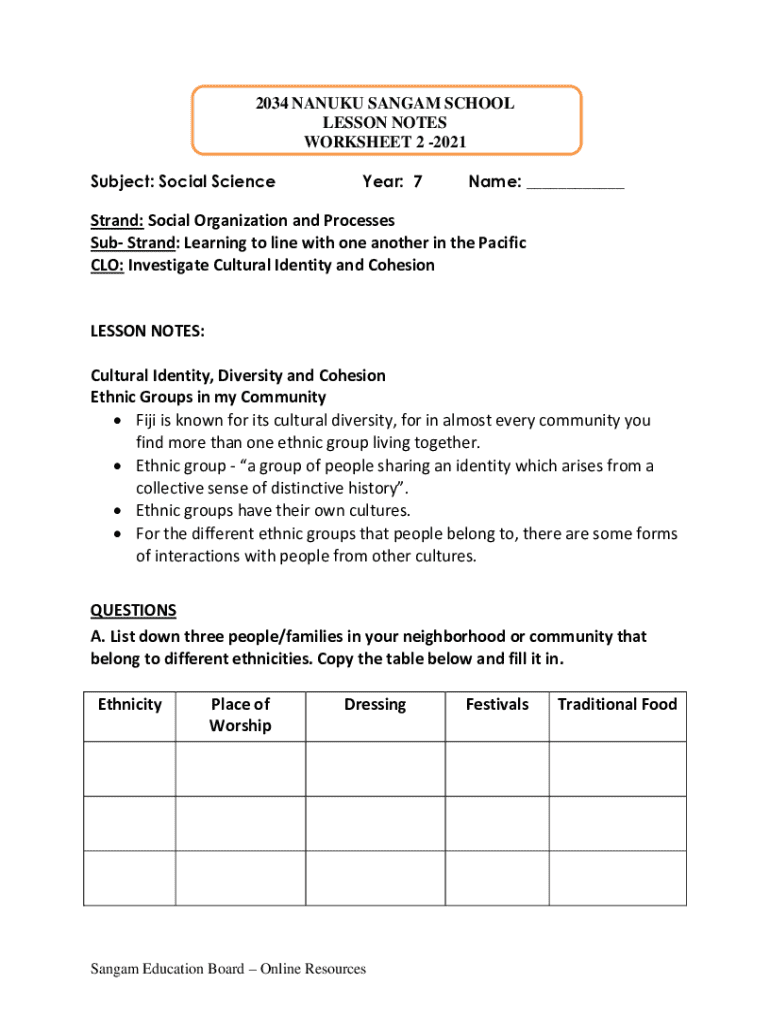The Fiji social science worksheet is designed specifically for 7th-grade Social Science lessons, emphasizing cultural identity and community diversity. This educational tool consists of a structured format that includes various components aimed at facilitating learning. Its primary educational goals revolve around teaching students about cultural identities and encouraging an appreciation of ethnic diversity in the classroom.