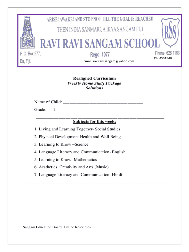 The Weekly Home Study Package comprises several critical components tailored for diverse subjects, including Mathematics, Science, and Social Studies. Each form includes specific fillable fields such as 'Name of Child' and 'Grade', ensuring personalized attention to each student's progress. Additionally, the form provides various activities to reinforce learning, which aligns with the Sangam school curriculum.