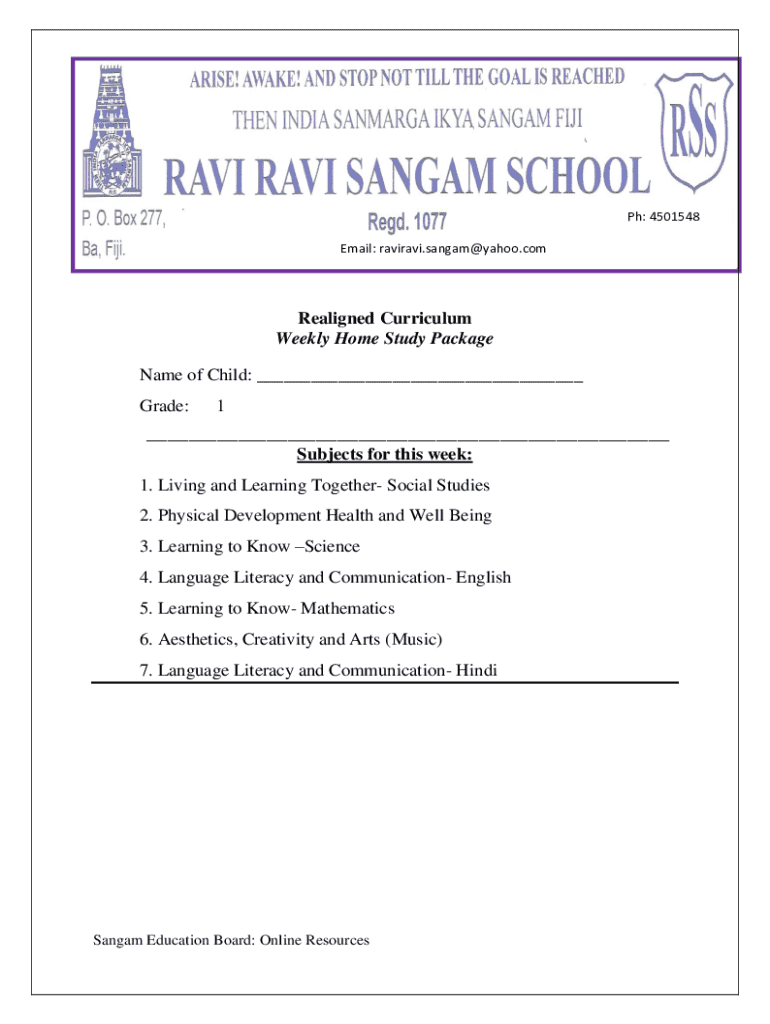 The Weekly Home Study Package is an educational document used by Year 1 students to complete various subjects including Social Studies, Healthy Living, and Elementary Science.