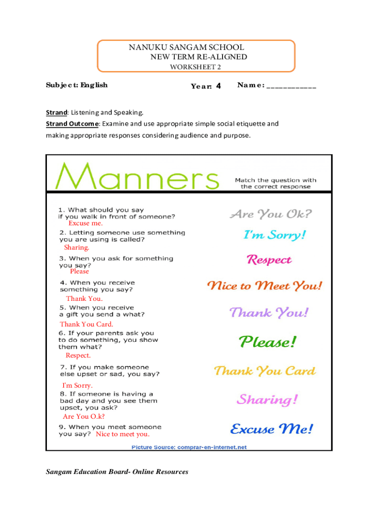 The Sangam Education Board Worksheet 2 is a student worksheet used by Year 4 pupils to practice subjects like English, Mathematics, and Healthy Living.