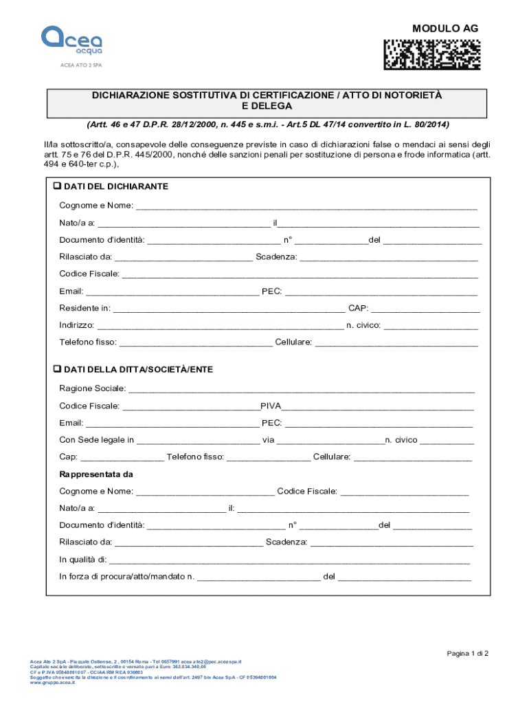 Il Modulo AG Dichiarazione Sostitutiva di Certificazione, noto anche come atto di notorietà, è uno strumento fondamentale per le dichiarazioni legali, utilizzato per certificare informazioni personali o aziendali. Questo modulo risulta particolarmente importante nelle pratiche di collegamento idrico e fognario, consentendo agli utenti di attestare la propria identità e di delegare responsabilità ad altre persone.